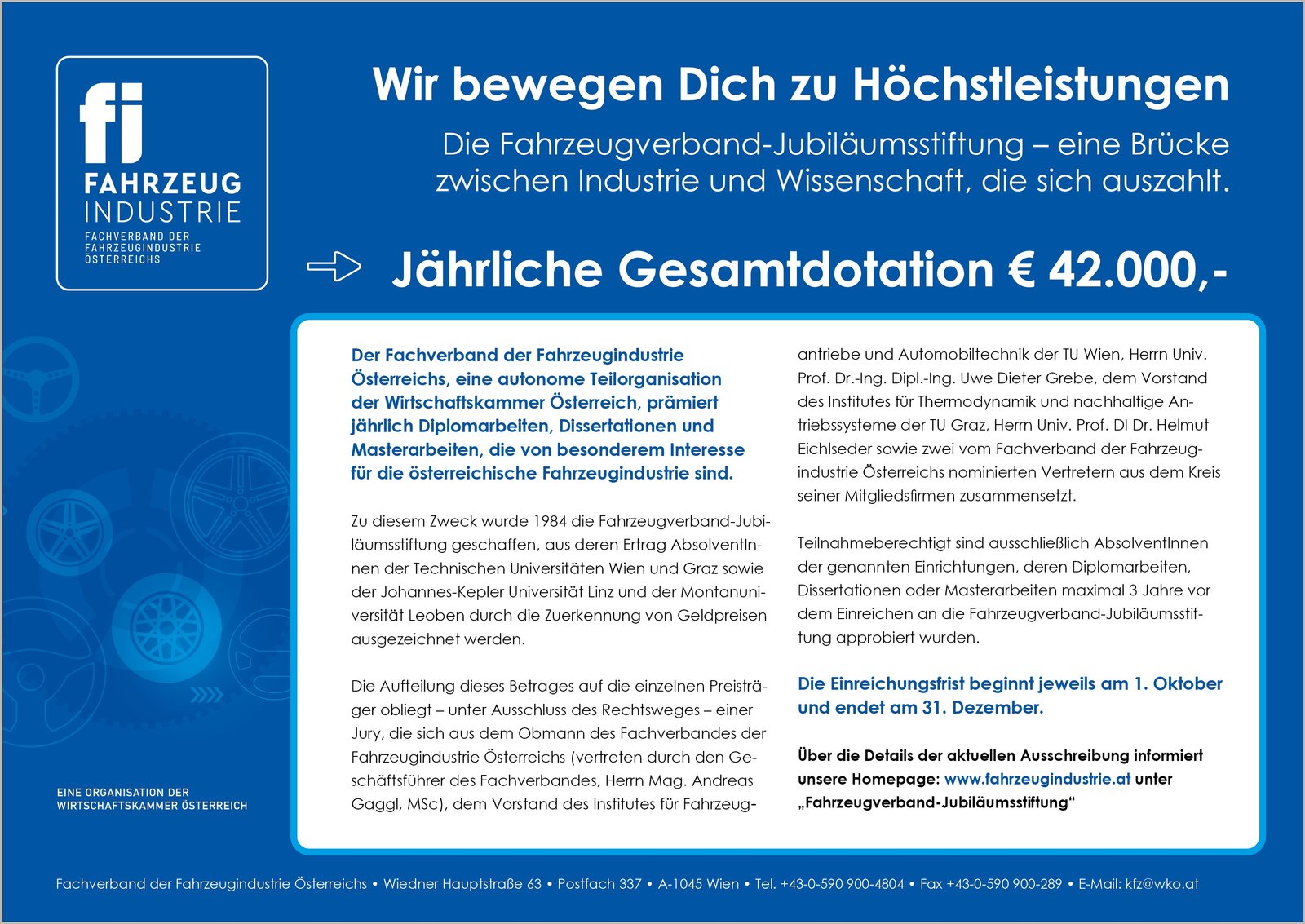 Bei Interesse wenden Sie sich bitte an den Fachverband. Wir freuen uns, dass Sie sich für uns interessieren. Qualitativ hochwertige und praxisnahe Ausbildung sind uns ein besonderes Anliegen. Aus diesem Grund wurde bereits im Jahre 1984 im Zusammenwirken mit den Rektoren und Senaten der Technischen Universitäten Wien und Graz die Fahrzeugverband-Jubiläumsstiftung ins Leben gerufen. Aus dem Zinsertrag dieser Stiftung werden jährlich DiplomandInnen und DissertantInnen, deren Arbeiten von besonderem Wert und Interesse für die österreichische Fahrzeugindustrie sind, durch die Zuerkennung von Geldpreisen in einer Gesamthöhe von € 42.000 ausgezeichnet.